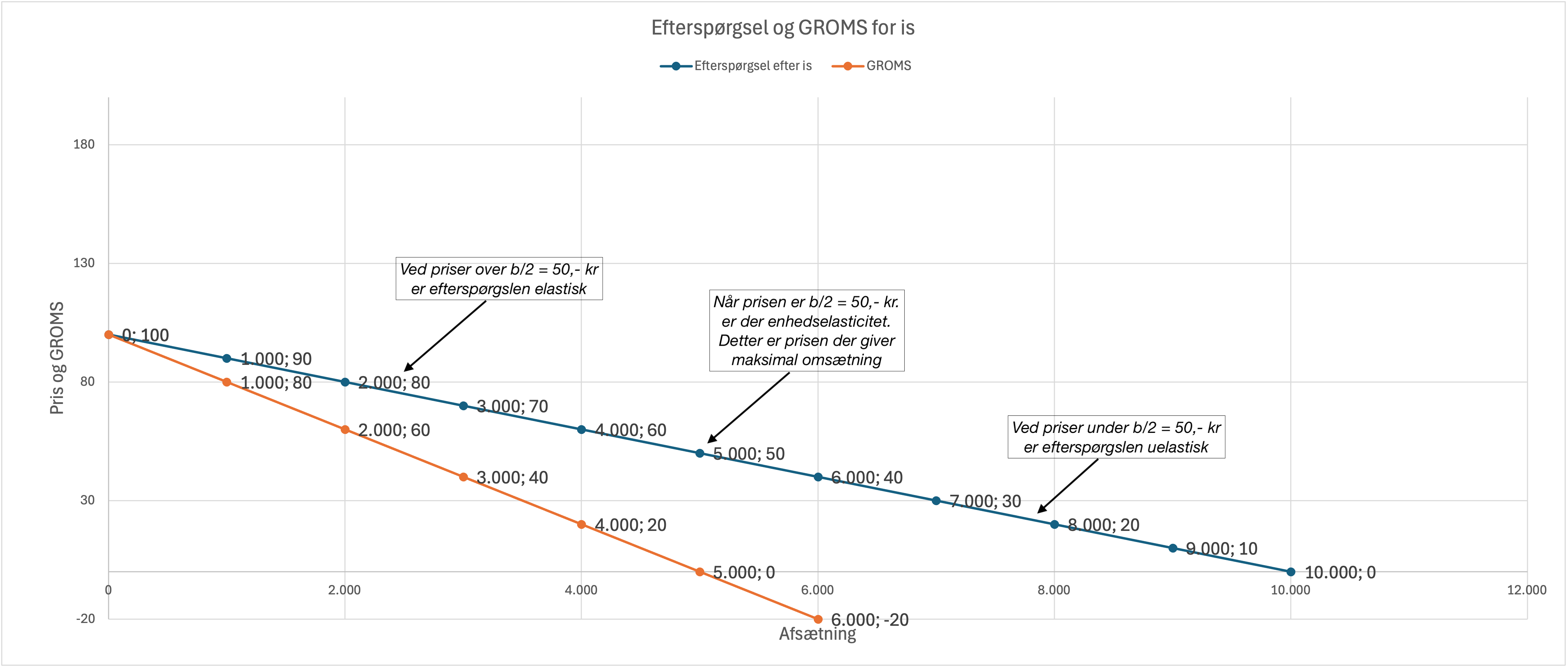 | 50,- | 5000 | E = -P / (100 - P) = -50/(100-50) = -1 | Enhedselastisk | Ved denne pris er efterspørgslen enhedselastisk, hvilket betyder, at en procentvis ændring i prisen medfører en tilsvarende procentvis ændring i den efterspurgte mængde. Dette er punktet for maksimal omsætning.